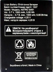 Аккумулятор Astro (S451) 1500mah Li-ion, оригинал. Соответствие: Astro S451. Размеры: (71,5 х 53 х 4мм.) крайний контакт (+)6мм. Гарантия 6 месяцев, доставка по Киеву и Украине. Есть доставка по СНГ.
