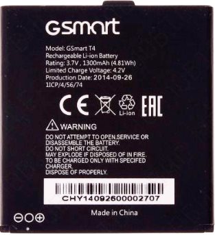 Аккумулятор GSmart (T4) 1300mAh Li-ion, оригинал. Соответствие: GSmart Gigabyte T4. Размеры: (56 х 52,5 х 4мм.) крайний контакт (-)4мм. Гарантия 6 месяцев, доставка по Киеву и Украине. Есть доставка по СНГ.