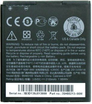 HTC (BM65100) 2100mAh Li-ion, 7.98Wh оригинал. 35H00213-00M. Соответствие: BA S930, HTC Desire 601, 700, 601 Dual, 510. Размеры: 60 х 53 х 5мм. крайний (+) 4мм.