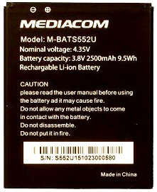 Mediacom (M-BATS552U) 2500mAh Li-ion, оригинал. Соответствие: Mediacom S552U Duo. Размеры: 76,5 х 61,5 х 4мм. крайний (-)11,5мм. Гарантия 6 месяцев, доставка по Киеву и Украине. Есть доставка в Россию и другие страны СНГ.