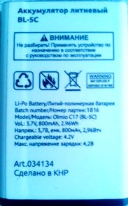 Пожалуйста, сформулируйте Ваши вопросы относительно Olmio (C17) 800mAh Li-ion, оригинал: