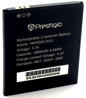 Prestigio (PAP4505) 1800mAh Li-polymer, 6.66Wh оригинал. Соответствие: Prestigio MultiPhone PAP4505 Duo. Размеры: 59,5 х 54 х 4,5мм. крайний (+)8мм. Гарантия 6 месяцев, доставка по Киеву и Украине. Есть доставка в Россию и другие страны СНГ.